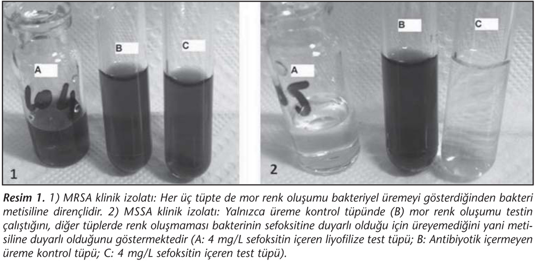 Kontrol tüpünde mor/menekşe bir renk oluşması yeterli üremenin varlığını gösterdiği için kalan test tüplerine de ayıraçtan aynı miktarda eklendi. Test tüplerinin her ikisinde de mor/menekşe renk değişimi gözlendiğinde bakterinin ürediği yani sefoksitine (dolayısıyla metisiline) dirençli olduğu sonucuna varıldı. Buna karşın sadece üreme kontrol tüpünde renk oluşumu gözlenirken, test tüplerinde renk oluşumunun gözlenmemesi, bakterinin sefoksitine (dolayısıyla metisiline) duyarlı olduğunu gösterdi (Resim 1).