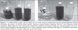 NRT sınır değer testinin uygulanması: Her bir izolat için bir üreme kontrol tüpü (antibiyotiksiz), bir test tüpü (4 mg/L sefoksitin içeren) ve bir de liyofilize test tüpü (4 mg/L sefoksitin içeren) kullanıldı. Liyofilize test tüpü kullanılmadan önce içine 1 ml KAMHBPN eklendi. Bunu takiben her 3 tüpe de 0.5 McFarland bulanıklığında hazırlanan bakteri süspansiyonlarından 50'şer µl eklendi ve tüpler 35ºC'de inkübe edildi. Beş saatlik inkübasyon süresinin ardından taze olarak hazırlanmış ayıraçtan (2 birim %0.2 sülfanilamid, 2 birim %0.1 NED ve 1 birim konsantre HCl) 500'er µl kontrol tüplerine eklendi. Kontrol tüpünde yeterli üremenin varlığını gösteren mor/menekşe bir rengin oluşması durumunda diğer iki tüpe de aynı miktarda ayıraç ilave edildi. Diğer iki test tüpünde de mor/menekşe renk değişiminin gözlendiği durumda bakterinin sefoksitine dirençli olduğu kabul edildi (Resim 1.1). Üreme kontrol tüpünde renk oluşumu gözlenirken, diğer iki test tüpünde renk oluşumunun gözlenmediği durumda ise bakterinin sefoksitine (dolayısıyla metisiline) duyarlı olduğuna karar verildi (Resim 1.2).