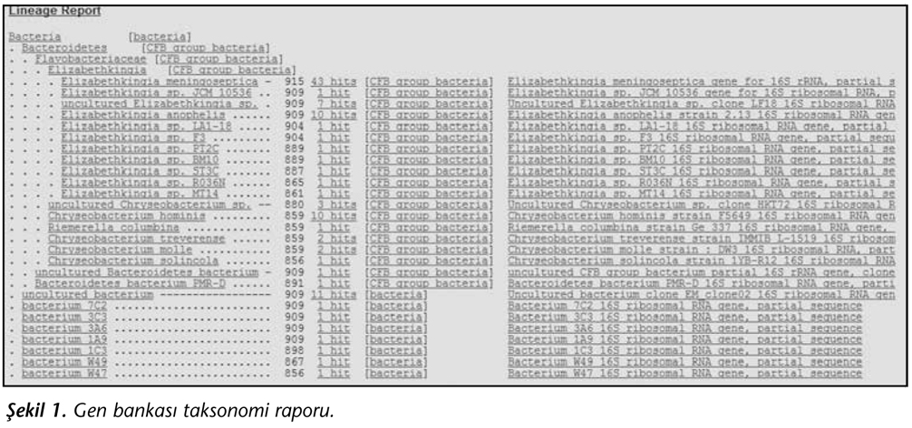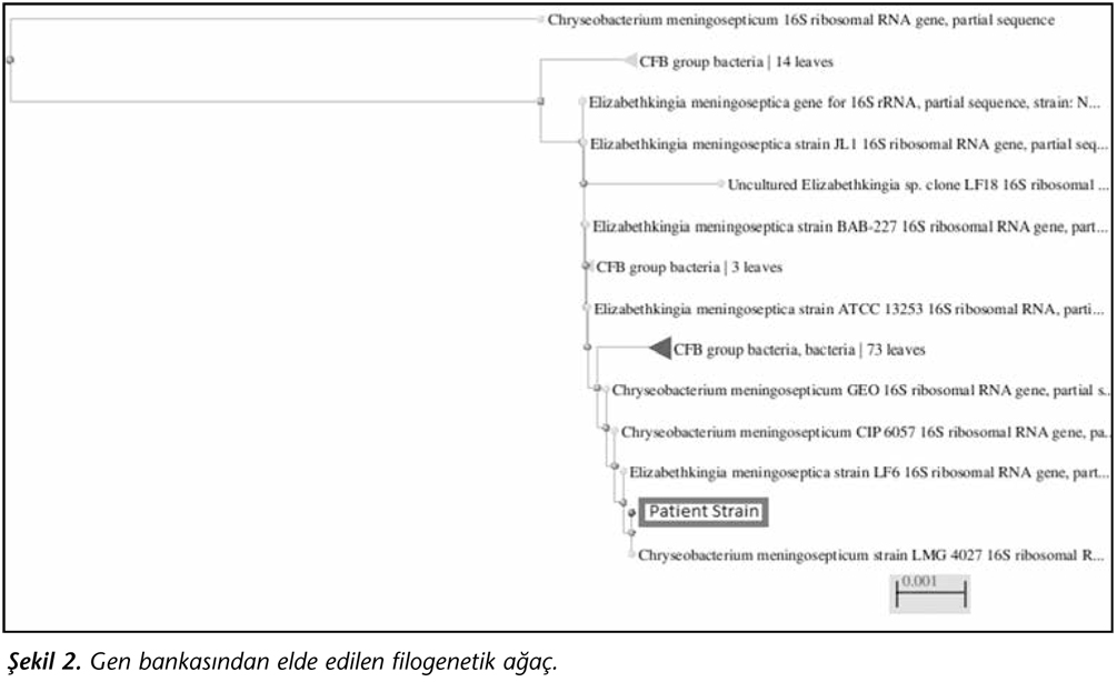 Dizi analizi için, kanlı agar besiyerinde 24 saatlik inkübasyon sonrası elde edilen saf kültürden 1x PCR Buffer (Qiagen, Almanya) içerisinde 0.5 McFarland konsantrasyonunda süspansiyon hazırlandı. Bu süspansiyonlardan 1 µl'lik kısım PCR'de kullanıldı. 16S rRNA gen bölgesinin çoğaltılması için 16S-F: 5'-AGA GTT TGA TCC TGG CTC AG-3' ve 16S-R: 5'-ACG GCT ACC TTG TTA CGA CTT-3' primerleri kullanıldı4. 50 µl final hacimde 25 µl 2x PCR Buffer, 1'er µl primer (25 pmol/ml) ve 1 µl bakteri süspansiyonu kullanılarak 95oC'de 15 dakika inkübasyonu takiben 95oC'de 30 saniye, 50oC'de 1 dakika ve 72oC'de 2 dakikalık inkübasyonların gerçekleştirildiği 40 döngülük klasik PCR işlemi ile 16S rRNA bölgesi çoğaltıldı. PCR ürünü, jel elektroforezinden sonra ticari bir kit (EZ-10 Spin Column Gel Extraction kit, Bio Basic, Kanada) kullanılarak üretici talimatları doğrultusunda saflaştırıldı. Saflaştırılan ürün BigDye terminator (LifeScience, ABD) kiti kullanılarak DNA dizi analizi işlemine tabi tutuldu. Elde edilen dizinin edisyonu DNAStar paketi içerisinde yer alan SeqMan yazılımı (DNAStar Package Madison, ABD) ile gerçekleştirildi. Elde edilen dizi, gen bankası BLAST yazılımı kullanılarak gen bankası veri tabanıyla karşılaştırıldı. Dizinin gen bankasında %99 oranında E.meningosepticum ile örtüştüğü gözlendi (Şekil 1,2).