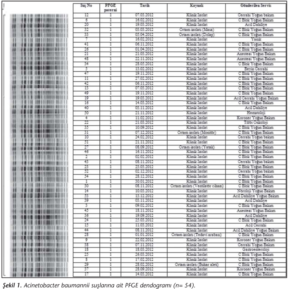 PFGE çalışmasında A.baumannii suşlarının tamamının DNA bant profillerinin aynı oldukları saptanmıştır. PFGE bant profillerinin sergilendiği A.baumannii suşlarının jel görüntülerinden sonraki aşamada dendogram analizi yapılmış ve suşların tek bir klondan kaynaklandığı belirlenmiştir (Şekil 1). Çevre izolatları, aynı üniteden alınan kan izolatları ve diğer ünitelerden alınan kan izolatlarının aynı kümede olması, hastanede meydana gelen salgının C blok YBÜ'den kaynaklandığını göstermiştir.