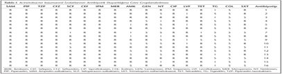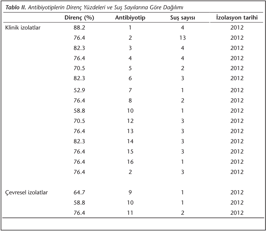 Kan kültürlerinden ve çevreden izole edilen suşlar antibiyotik duyarlılıklarına göre gruplandırıldığında 16 farklı patern ortaya çıkmış; bunlardan Grup 2, 16 (%29.6) izolat ile en büyük grubu oluşturmuştur. Diğer gruplarda suş sayısı 1-4 arasında değişmektedir (Tablo I ve II).