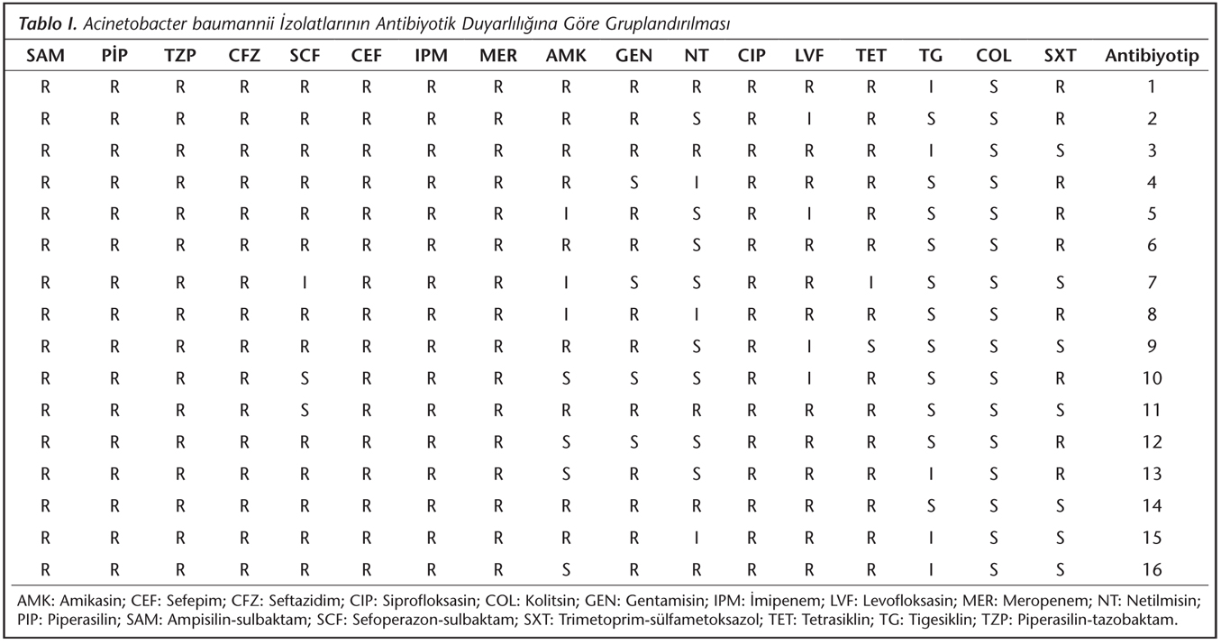 Kan ve ortam izolatlarının tanımlanması ve antibiyotik duyarlılık testleri Vitek 2 (BioMérieux, Fransa) otomatize sistemiyle yapıldı. Antibiyotik duyarlılık sonuçları CLSI standartlarına göre yorumlandı16 ve test sonuçları duyarlı (S), orta (I) veya dirençli (R) olarak belirtildi. İzolatların antibiyotiklere karşı gösterdiği direnç profilleri "antibiyotip" olarak isimlendirildi ve benzer profile sahip örnekler aynı biyotip içinde kategorize edildi.