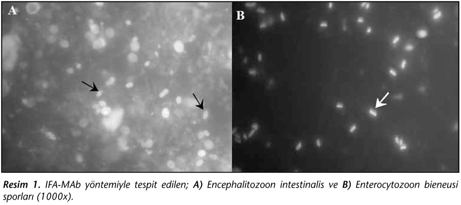 Mikrosporidiyozis, son yıllarda immün sistemi baskılanmış hastaların artmasıyla hem gelişmiş hem de gelişmekte olan ülkelerde giderek artış gösteren ve önemi gittikçe artan bir hastalıktır8. AIDS'li hastaların yanı sıra, organ nakli yapılanlarda, çocuk ve yaşlılarda inatçı ishal ve sistemik hastalıkların nedeni olarak kabul edilmektedir9. Gastrointestinal mikrosporidiyozisin tanısında transmisyon elektron mikroskopi (TEM) altın standart olarak kabul edilse de, özgüllüğü yüksek olmakla birlikte duyarlılığı düşüktür; ayrıca emek-yoğun ve zaman alıcı bir yöntemdir. Rutin klinik laboratuvarlarda tanı için farklı boyama yöntemleri kullanılmaktadır10,11. Buna karşın son on yıldır araştırma laboratuvarlarında teşhis ve tür tespiti amacıyla moleküler yöntemler kullanıma girmiş ve bu yöntemlerin genotip tayini için önemli olduğu bildirilmiştir1,12,13. Ayrıca bazı mikrosporidia türlerinin tespitinde yüksek özgüllük ve duyarlılığa sahip olduğu bildirilen IFA-MAb yöntemi de diğer yöntemlerle birlikte kullanılmaktadır3,4,13.