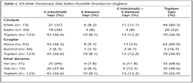 Kemoterapi alan kanserli hastalarda E.intestinalis ve E.bieneusi prevalansının araştırıldığı bu çalışmada, IFA-MAb yöntemi ile 93 hastanın %46.2'sinde E.intestinalis, %9.7'sinde E.bieneusi ve %14'ünde karışık olmak üzere toplam %69.9 (n= 65) oranında mikrosporidia pozitifliği saptanmıştır. Kontrol grubunda (n= 30) ise bu oranlar sırasıyla; %6.7, %3.3, %6.7 ve toplam olarak %16.7'dir (Tablo I). Çalışmamızda E.intestinalis'e daha sık rastlandığı dikkati çekmiştir. Hasta ve kontrol gruplarının pozitiflik oranları arasındaki fark istatistiksel olarak anlamlı bulunmuş (p< 0.05) olup, beklenen bir sonuç olan bu durum, immün sistemi baskılanmış hastalarda mikrosporidia enfeksiyonlarının önemini vurgulamaktadır. Ülkemizde ve dünyada yapılan çalışmalarla kıyaslandığında, çalışmamızda saptanan yüksek pozitiflik oranının ise; çalışmaya alınan hasta grubunun özelliği ve ayrıca çoğunun gastrointestinal şikayetleri bulunan hastalardan (n= 51; %55) oluşmasından kaynaklandığı düşünülmüştür.