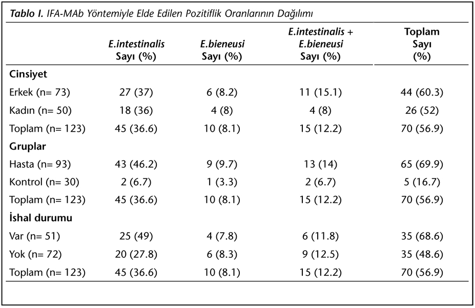 Çalışmamızda, IFA-MAb yöntemiyle kanserli hastaların 65 (%69.9)'inde ve sağlıklı kontrollerin 5 (%16.7)'inde olmak üzere toplam 70 (%56.9) olguda pozitiflik saptanmıştır (Tablo I) (Resim 1). Hasta ve kontrol grubunun pozitiflik oranları arasındaki fark istatistiksel olarak anlamlı bulunmuştur (p< 0.05). Pozitif olguların %60.3'ü erkek, %52'si ise kadın olup, cinsiyetler arasındaki fark istatistiksel olarak anlamlı değildir (p= 0.234) (Tablo I). Mikrosporidia pozitifliği, ishal varlığına göre değerlendirildiğinde; ishalli olan (51 hasta) ve olmayan (42 hasta, 30 kontrol) olgular arasında istatistiksel olarak anlamlı bir farkın olduğu görülmüştür (%68.6'ya karşı %48.6; p= 0.021) (Tablo I).