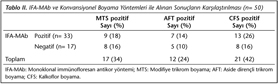 IFA-MAb yöntemi ile 33'ü pozitif, 17'si negatif toplam 50 hasta, konvansiyonel boyama yöntemleriyle incelenmiş ve bunların 17'si MTS, 12'si AFT, 21'i ise kalkoflor boyama (CFS) yöntemi ile pozitif sonuç vermiştir (Tablo II) (Resim 2). Tüm boyama yöntemlerinin uygulandığı 50 örnek dikkate alındığında, IFA-MAb ile negatif bulunan 17 örneğin 8'i MTS ve CSF ile, bunların 5'i ise AFT ile pozitif bulunmuştur (Tablo II).