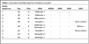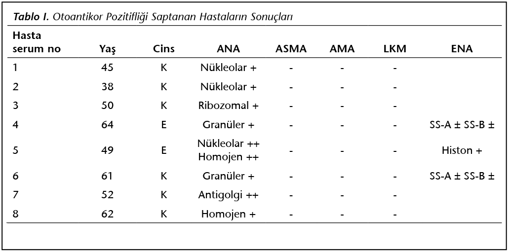 Hasta grubu yaş ortalaması 52.0 (yaş aralığı: 25-69) kontrol grubu ise 32 (yaş aralığı: 24-47) olarak belirlenmiştir. �alışılan serum �rneklerinin %17'si pozitif sonu� vermiştir. �alışılan �rneklerde AMA, ASMA ve LKM pozitifliği saptanmamıştır. Tıbbi kayıtlara g�re, pozitif sonu� saptanan hastalarda otoimm�n bozukluk tanısı saptanmamıştır. Toplam 47 serum i�inde AMA, ASMA ve LKM pozitifliği saptanmazken, altı kadın iki erkek hasta olmak �zere toplam sekiz hasta serumunda ANA pozitifliği saptanmıştır. Bir hastada homojen ve n�kleoler "++" karışık patern, bir hastada "++" olmak �zere sitoplazmada polar benekli (anti-golgi kompleksi benzeri) boyanma paterni g�r�lm�şt�r. Diğer altı serumdaki pozitiflik, n�kleoler (iki �rnek), gran�ler (iki �rnek), ribozomal (bir �rnek) ve homojen (bir �rnek) patern ve t�m� "+" olarak değerlendirilmiştir. ENA pozitifliği gran�ler patern saptanan hastalarda SS-A ve SS-B "kuşkulu" ve karışık patern saptanan hastada histon "+" şeklinde belirlenmiştir. Kalan altı hastada ENA negatif bulunmuştur. Ki-kare testi ile otoantikor varlığı a�ısından hasta ve kontrol grubu arasında istatistiksel olarak anlamlı fark bulunmuştur (p< 0.05). Cinsiyet ve yaş ile otoantikor pozitifliği arasında ise istatistiksel ilişki saptanmamıştır (p> 0.05). Sonu�lar Tablo I'de g�sterilmiştir.