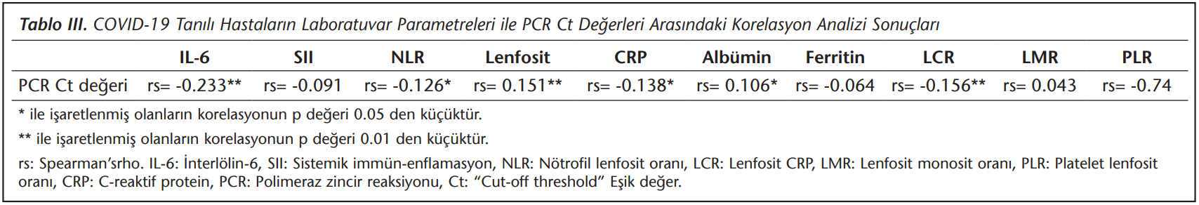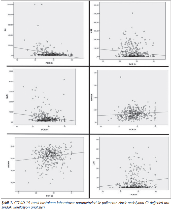 Çalışmamızda serum IL-6, NLR ve CRP değerleriyle PCR Ct değerleri arasında anlamlı negatif korelasyon ve lenfosit değeri ile anlamlı pozitif korelasyon saptanmıştır. Klinik örneklerdeki inhibitör faktörler ve testin lineer dinamik aralığı nedeniyle Ct değeri ve logaritmik viral yük doğru orantılı olmayabilir ancak daha yüksek Ct değerleri genellikle daha düşük viral yüklerle ilişkilidir[35]. Amerika Birleşik Devletleri’nde yapılan bir çalışmaya göre düşük Ct değerleri olan hastalar daha ağır seyir göstermektedir[36].