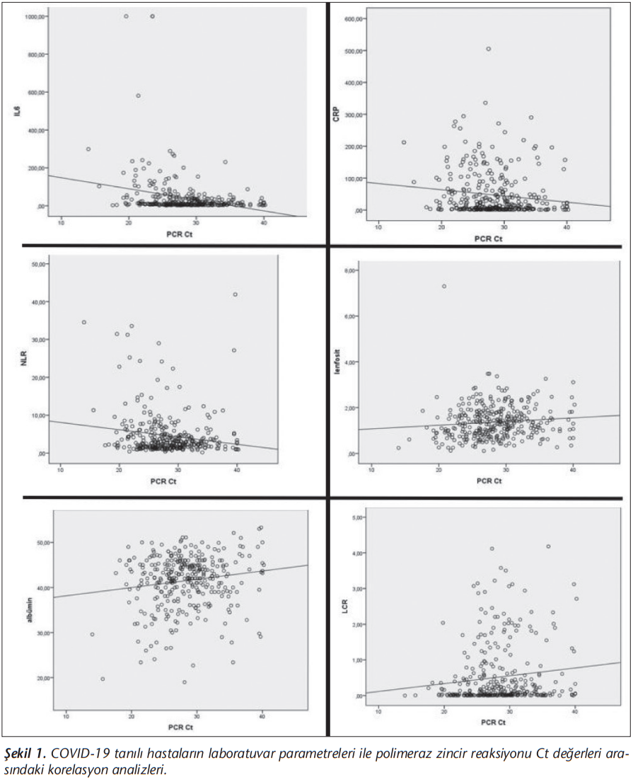 Yapılan istatistiksel analizde serum IL-6, NLR, LCR ve CRP değerleri ile Ct değerleri arasında anlamlı negatif korelasyon (sırasıyla p< 0.01, r= -0.233; p= 0.021, r= -0.126; p= 0.004, r= 0.156 ve p= 0.011, r= -0.138) ve lenfosit ile albümin değeri ile anlamlı pozitif korelasyon saptanmıştır (sırasıyla p=0.005; r= 0.151 ve p= 0.050; r= 0.106) (Tablo 3) (Şekil 1).