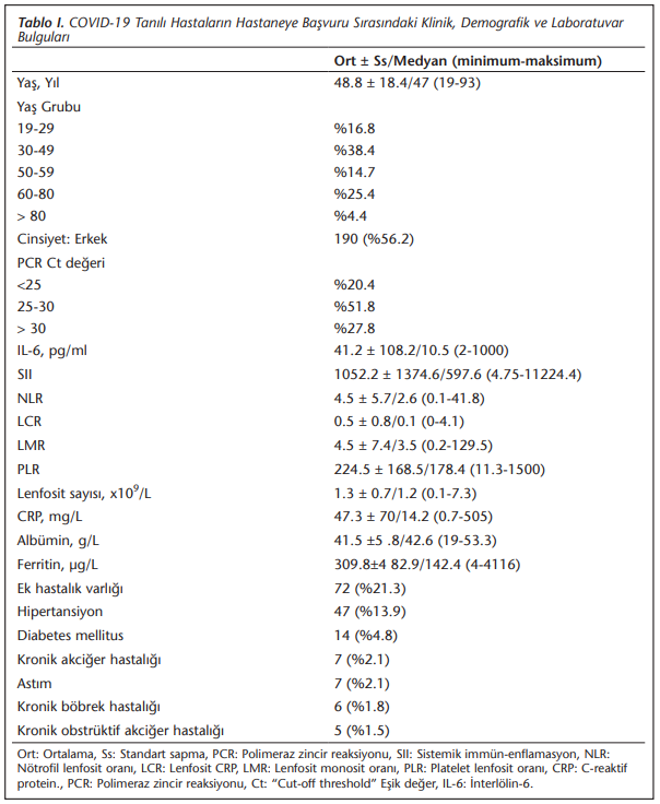 İleri yaş, düşük Ct değeri, yüksek IL-6 düzeyleri, yüksek SII, hipoalbüminemi, yüksek ferritin düzeyleri, lenfopeni, yüksek NLR, düşük LCR, düşük LMR, yüksek PLR ve yüksek CRP’si olan hastalarda progresyon daha ciddi olup bu hastalarda yoğun bakım takibi, entübasyon ve mortalite daha fazla gözlenmektedir. IL-6, NLR, LCR, CRP’nin yüksekliği, lenfopeni ve hipoalbüminemi, düşük Ct değerleri ile korelasyon göstermiştir. Bu konuda daha kapsamlı, çok merkezli prospektif çalışmalara ihtiyaç vardır.