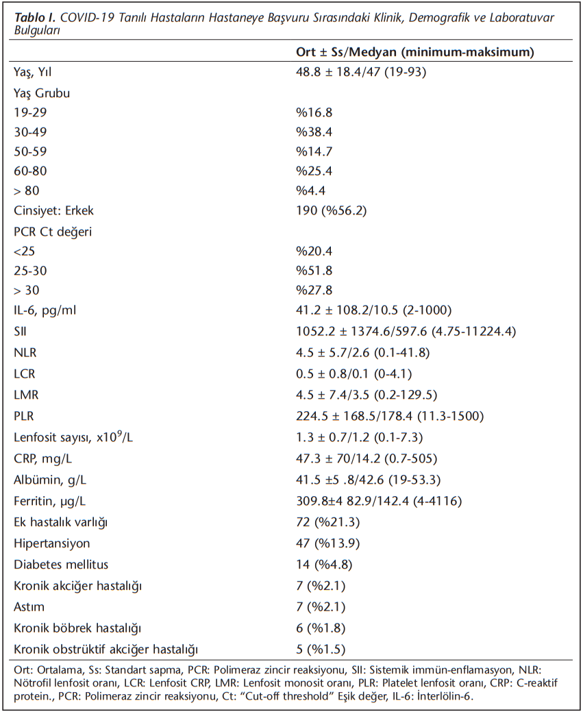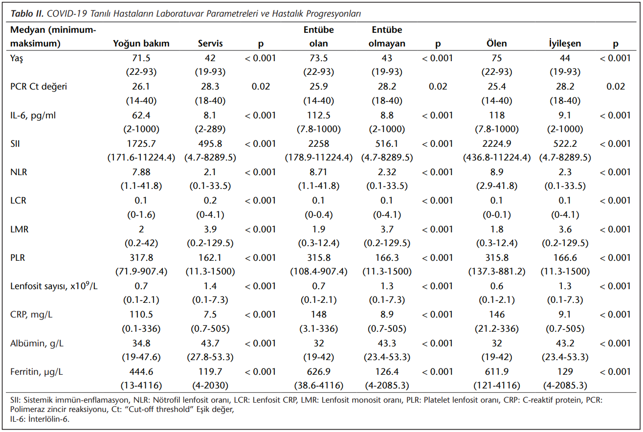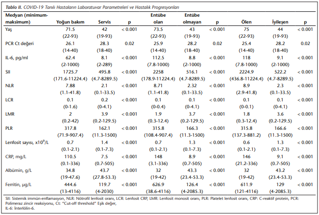 İleri yaş, düşük Ct değeri, IL-6 artışı, SII’da artış, albüminde azalma, ferritin artışı, lenfosit sayısında azalma, nötrofil lenfosit oranında (NLR) artış, lenfosit CRP oranında (LCR) azalma, lenfosit monosit oranında (LMR) azalma, platelet lenfosit oranında (PLR) artış ve CRP düzeyinde artış; yoğun bakımda yatan hastalarda serviste takip edilen hastalara göre, entübe olan hastalarda entübe olmayan hastalara göre ve ölen hastalarda iyileşen hastalara göre istatistiksel olarak anlamlı düzeyde farklı bulunmuştur (sırasıyla p< 0.001; p= 0.02; p< 0.001; p< 0.001; p< 0.001; p< 0.001; p< 0.001; p< 0.001; p< 0.001; p< 0.001; p< 0.001; p< 0.001) (Tablo 2).