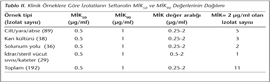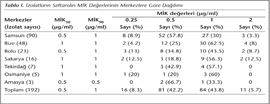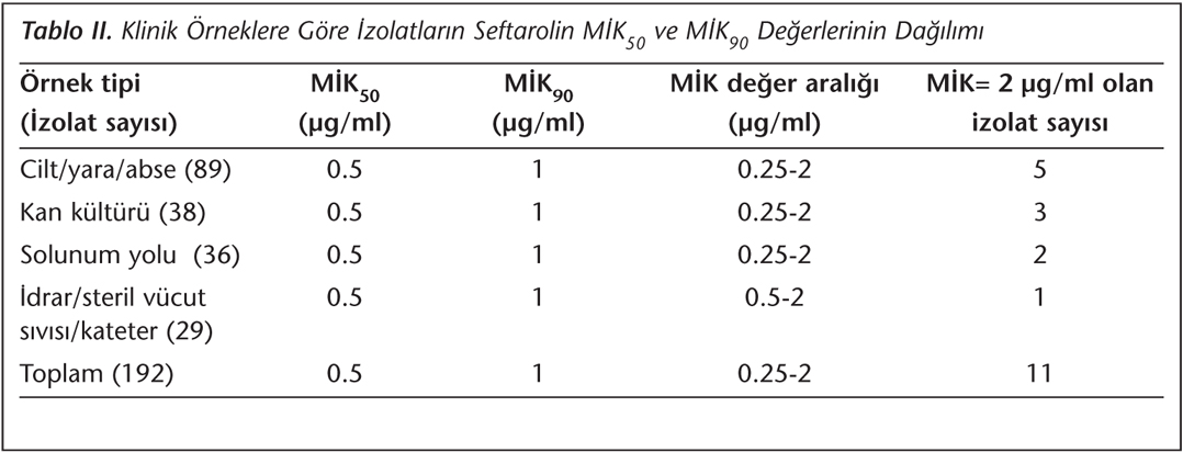 Klinik örnek türüne göre değerlendirme yapıldığında ise MİK50 ve MİK90 değerlerinin genel dağılıma ait değerlerle aynı olduğu belirlenmiş (Tablo II), seftaroline orta duyarlı kabul edilen izolat sayıları bakımından gruplar arasında anlamlı fark bulunamamıştır (p> 0.05).