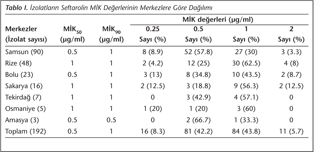 Çalışmaya alınan tüm izolatlar değerlendirildiğinde, MİK50, MİK90 ve MİK aralığı sırasıyla 0.5 µg/ml, 1 µg/ml ve 0.25-2 µg/ml olarak bulunmuştur. Yedi merkezden elde edilen izolatların MİK değerleri Tablo I'de gösterilmiştir. Toplam 181 (%94.3) izolatın MİK değeri ≤ 1 µg/ml olarak saptanmış ve CLSI kriterlerine göre duyarlı olarak belirlenmiştir. On bir (%5.7) izolatın MİK değeri ise 2 µg/ml olarak belirlenmiş ve orta duyarlı olarak kabul edilmiştir. Merkezlerde orta duyarlı olarak belirlenen izolatların oranı %0-12.5 arasında değişiklik göstermiştir (Tablo I). Merkezler arasında seftaroline duyarlı izolat oranı bakımından anlamlı farklılık bulunamamıştır (p> 0.05).