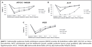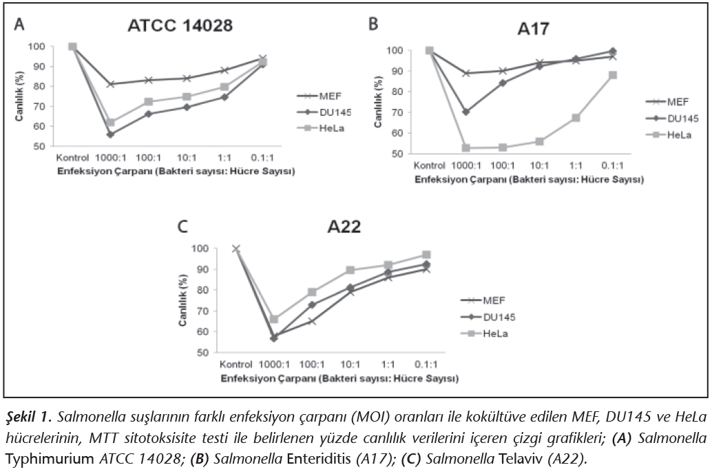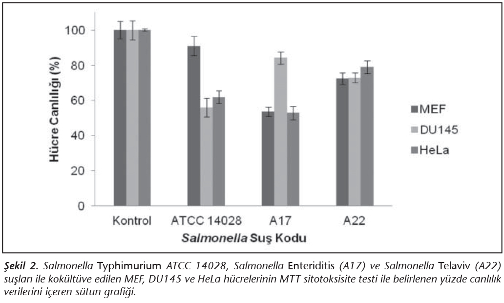 MEF, DU145 ve HeLa h�cre k�lt�rlerinin Salmonella suşları ile 100:1 MOI oranında 4 saat kok�lt�r� sonucu, MTT sitotoksisite testinde saptanan h�cre canlılığı y�zdeleri Şekil 2'de s�tun grafiği halinde g�sterilmiştir. Herhangi bir bakteri ile kok�lt�ve edilmeyen kontrol gruplarının canlılık y�zdesi %100 olarak kabul edilerek yapılan grafiğe g�re; S.Telaviv (A22) suşu her �� h�cre k�lt�r�nde de benzer sitotoksik etki g�sterirken, S.Typhimurium ATCC 14028 suşu en az MEF h�cre canlılığını (%91), S.Enteriditis (A17) suşu ise en az DU145 h�cre canlılığını (%84.2) etkilemiştir (Şekil 2).