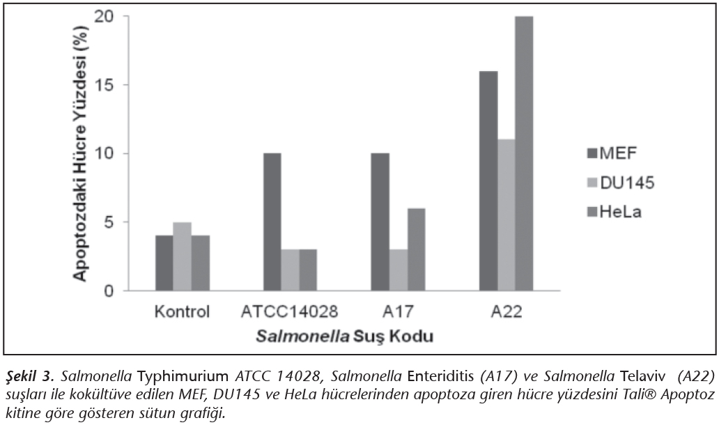 Salmonella suşları ile 100:1 MOI oranında 4 saat kok�lt�vasyon sonucu, MEF, DU145 ve HeLa h�cre k�lt�rlerinde apoptoza giren h�cre y�zdeleri Şekil 3'te g�r�lmektedir. Salmonella suşları ile kok�lt�ve edilmeyen kontrol gruplarında apoptozdaki h�cre y�zdesi %5 oranında kalırken, en fazla apoptotik etkiyi S.Telaviv (A22) suşu g�stermiştir. S.Typhimurium ATCC 14028 ve S.Enteriditis (A17) suşları sırasıyla MEF h�crelerinde %10, DU145 h�crelerinde %3 apoptotik etkiye sebep olurken, HeLa h�creleri �zerinde S.Typhimurium ATCC 14028 suşu %3, S.Enteriditis (A17) suşu %6 apoptotik etkiye sebep olmuştur (Şekil 3).
