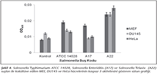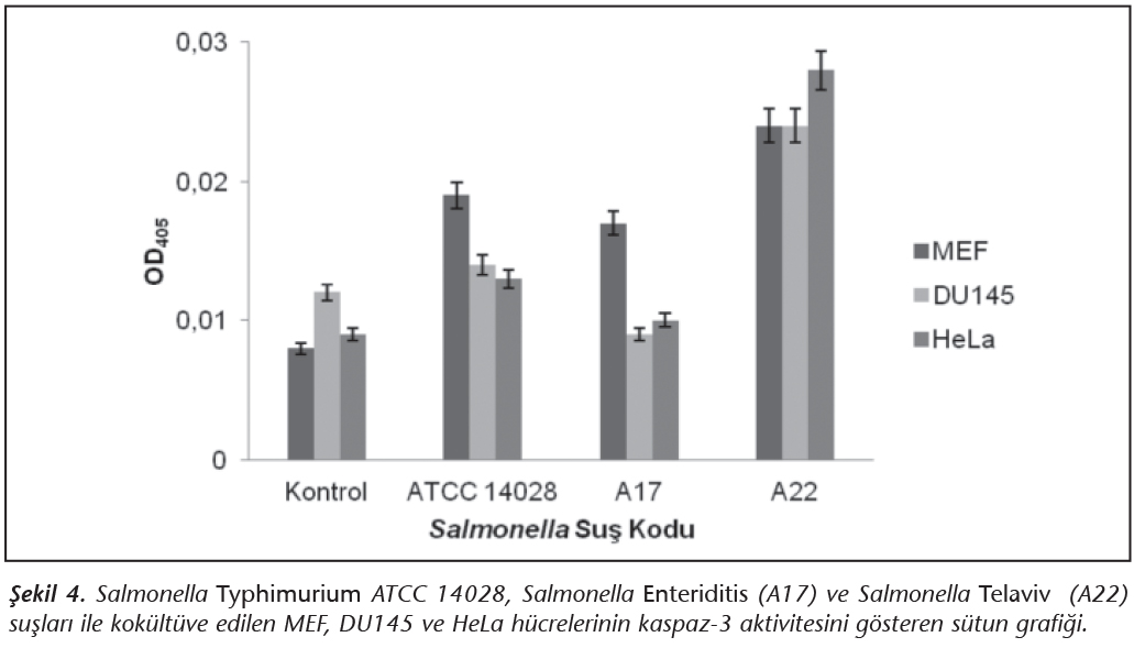 Salmonella suşlarının h�cre k�lt�rlerindeki apoptoza etkisinin kaspaz-3 aktivitesi ile değerlendirilmesi amacıyla yapılan deneyde, OD405�de okunan değerler Şekil 4'de verilmiştir. Buna g�re, h�cre k�lt�rlerinde kaspaz-3 aktivitesinde en �ok artışa sebep olan suş S.Telaviv (A22)'dir. Kontrol grupları i�in h�cre tipi ayırt etmeksizin kaspaz-3 aktivitesinin OD405 değeri yaklaşık 0.01 değerinde kalırken, MEF h�crelerinde bu değer S.Typhimurium ATCC 14028 ve S.Enteriditis (A17) i�in 0.02'ye yaklaşmıştır.