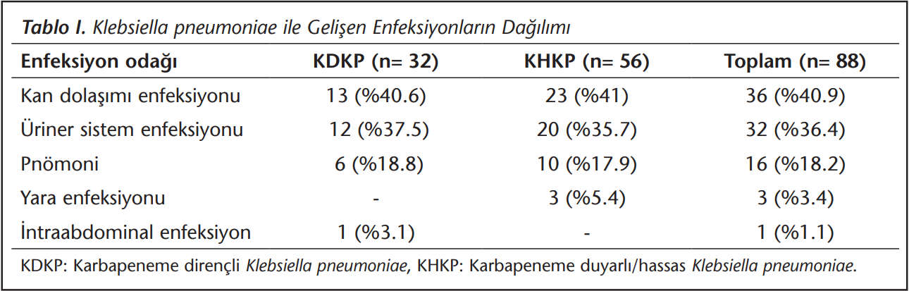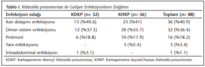 YBÜ’de belirtilen süre içerisinde ve kriterlerde K.pneumoniae enfeksiyonu gelişen toplam 88 hasta çalışmaya dahil edilmiştir. Hastaların yaş ortalaması 74 ± 15 (yaş aralığı: 21-93) yıl olarak belirlenmiş olup %60.2’sini kadınlar oluşturmuştur. KDKP enfeksiyonu 32 (%36.4) hastada, karbapeneme duyarlı/hassas K.pneumoniae (KHKP) enfeksiyonu ise 56 hastada saptanmıştır. KDKP saptanan olgularda kombine disk difüzyon yöntemi ile yapılan karbapenemaz tarama testinde %68.8 oranında OXA-48, %6.3 oranında MBL ve %6.3 oranında KPC varlığı saptanmıştır.