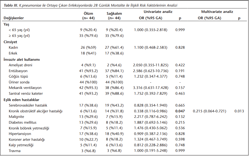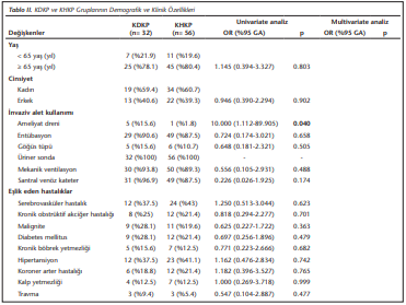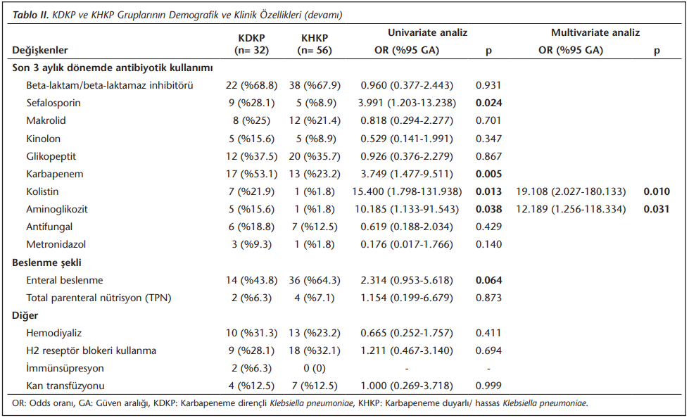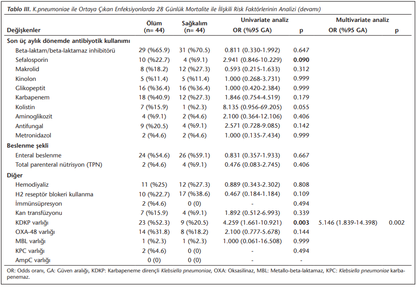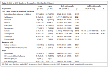 (Tablo 2)’de, K.pneumoniae enfeksiyonu gelişen hastalar arasından KDKP gelişiminde hastaların klinik özellikleri, yapılan invaziv işlemler, eşlik eden hastalıklar, enfeksiyon gelişmeden önceki son üç aylık dönemde maruz kaldıkları antibiyotikler, beslenme şekli gibi potansiyel risk faktörlerinin tek değişkenli ve çok değişkenli analiz sonuçları gösterilmiştir. Bu analizlere göre; hastalarda ameliyat dreni varlığı, enteral beslenme, enfeksiyon ortaya çıkmadan önceki son üç aylık dönem içerisinde sefalosporin, karbapenem, kolistin ve aminoglikozit gibi antibiyotiklere maruziyet KDKP ile ilişkili enfeksiyonların gelişimi ile ilişkili bulunmuştur (p< 0.10). Çok değişkenli lojistik regresyon analizinde KDKP gelişimi açısından iki bağımsız risk faktörü bulunmuştur. Bunlar son üç aylık dönem içerisinde kolistin (OR= 19.108; %95 GA= 2.027-180.133; p= 0.010) ve aminoglikozit (OR= 12.189; %95 GA= 1.256-118.334; p= 0.031) kullanımıdır. Kolistine maruziyet KDKP gelişme riskini 19.108 kat arttırırken, aminoglikozit maruziyetinin KDKP gelişiminde 12.189 kat risk oluşturduğu görülmüştür. Çalışma döneminde 28 günlük mortalite oranları KDKP grubunda (23/32) %71.9, KHKP grubunda (21/56) %37.5 olarak bulunmuştur (p= 0.002). (Tablo 3)’te 28 günlük mortalite ile ilişkili faktörlerin tek değişkenli ve çok değişkenli analizleri özetlenmiştir. Tek değişkenli analiz sonuçlarına göre; hastalarda eşlik eden kronik obstrüktif akciğer hastalığı (KOAH) varlığı, son üç ay içinde sefalosporin ve kolistin grubu antibiyotiklerle tedavi almış olma ve KDKP varlığı 28 günlük mortalite gelişimi ile ilişkili bulunmuştur (p< 0.10). Çok değişkenli lojistik regresyon analizinde mortalite gelişimi açısından KDKP varlığı (OR= 5.146; %95 GA= 1.839-14.398; p= 0.002) bağımsız risk faktörü olarak bulunmuştur. KDKP varlığının mortalite gelişme riskini 5.146 kat artırdığı saptanmıştır.