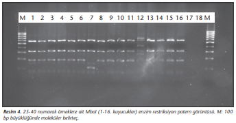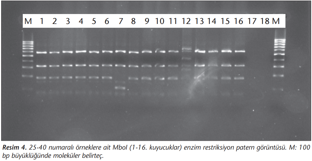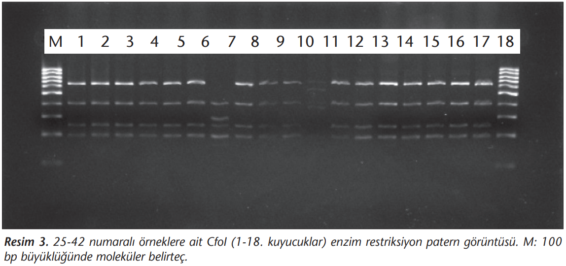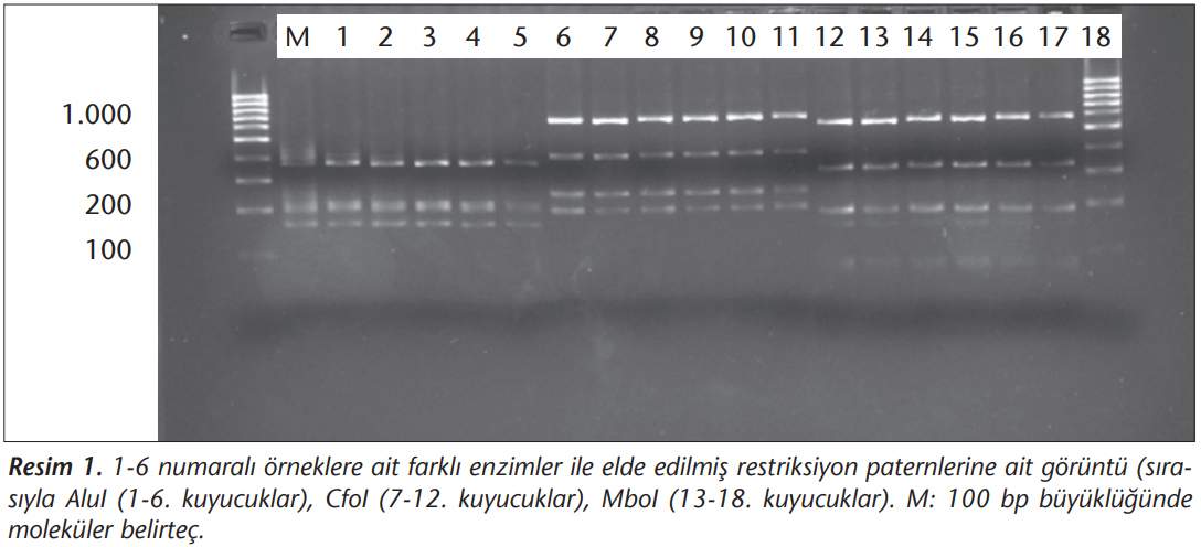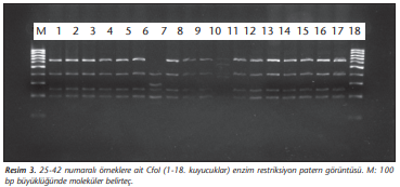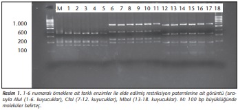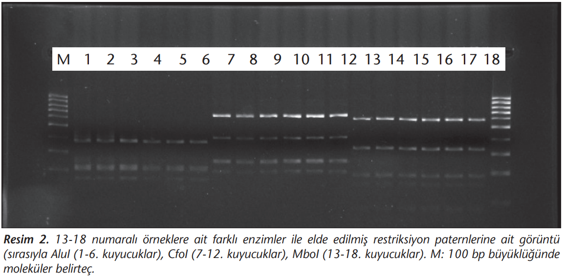 ARDRA yöntemiyle 180 izolattan dördü (TR10, TR31, TR35 ve TR52) dışında tüm izolatlar A.baumanniiAcinetobacter baumannii olarak tanımlanmıştır. TR31 izolatı dışında, tüm izolatlarda sırasıyla; AluI, CfoI, MboI enzimleri için 1,1,1 paternleri saptanmıştır. Otuz bir numaralı örnek için ise AluI, CfoI, MboI, Mspl ve Rsal enzimleri için sırasıyla 1, 2, 3, 3, 1 paternleri elde edilmiş ve A.pittii olarak tanımlanmıştır (Tablo 2). ARDRA 16S rRNA gen kesim paternlerine ait görüntüler sırasıyla (Resim 1)-(Resim 4)’te verilmiştir.