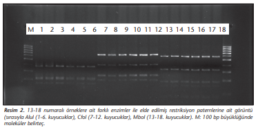 Amplifikasyon ürününden 9 µl, 5 U restriksiyon enzimi içeren 20 µl restriksiyon tamponu (Promega, ABD) içerisinde 37°C’de dört saat inkübe edilmiştir. Restriksiyonu sonlandırmak için 5 ml 5X sample buffer [gliserol, %25 (wt/vol), sodyum dodesil sülfat, %0.5 (wt/vol), EDTA, 50 mM; bromfenol blue, %0.05] eklendi. Restriksiyon fragmanları %2.5’lik Nusieve agaroz 3:1 jel kullanılarak görüntülenmiş ve elde edilen sonuçlar değerlendirilmiştir[6],[7]. Çalışmada A.baumannii ATCC 19606 suşu pozitif kontrol olarak kullanılmıştır. Enzim kesimi için AluI, CfoI, MboI MspI, RsaI enzimleri kullanılmıştır. Ön çalışma için beş örnekte (156, 163-166) enzimlerin hepsiyle kesim yapıldıktan sonra sonuçlar literatür bilgisi eşliğinde değerlendirildi, MspI ve RsaI enzimlerinin ARDRA profilini belirlemede ek bir bilgi sağlamadığı anlaşılarak, kalan örnekler için AluI, CfoI, MboI enzimleri ile çalışmaya devam edildi[6].