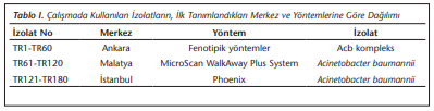 Bu çalışma, Ankara, Malatya ve İstanbul Tıp Fakültesi hastanelerinde gerçekleştirilen çok merkezli bir çalışma olarak planlandı. Ocak 2016-Aralık 2016 tarihleri arasında YBÜ’lerde tedavi gören hastaların kan örneklerinden izole edilen karbapenem dirençli Acb kompleks (izolat numaraları: TR1-TR60) ve A.baumannii (TR61-TR180) izolatları araştırmaya dahil edildi. Her hastanın yalnız tek bir örneğinden elde edilen izolatlar o merkeze ait -20°C derin dondurucularda saklandı (Tablo 1).