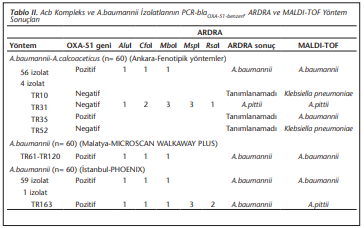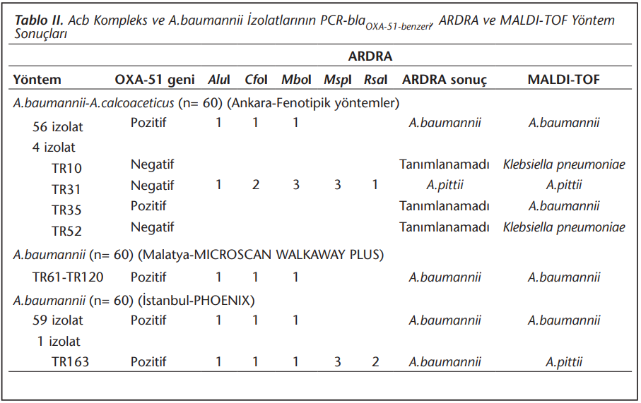 Bu çalışmada incelenen 180 Acb kompleks izolatının 177 (%98.3)’sinde blaOXA-51-benzeri geni saptanmış ve tümü ARDRA ve/veya MALDI-TOF yöntemi ile A.baumannii olarak tanımlanmıştır. blaOXA-51-benzeri geni saptanamayan üç izolat, ARDRA ve/veya MALDI-TOF yöntemi ile A.baumannii dışı olarak isimlendirilmiştir.