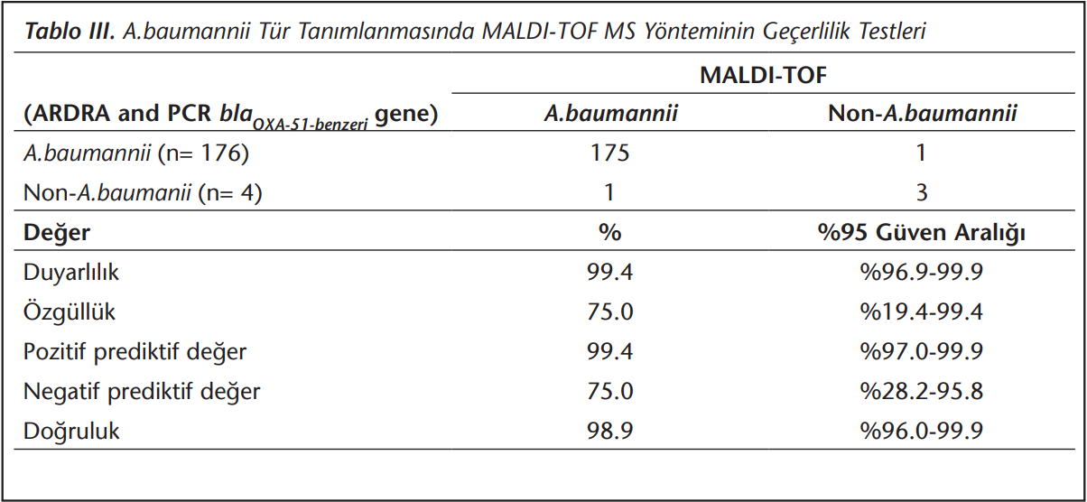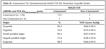 ARDRA ve Rt-PCR-blaOXA-51-benzeri yöntemlerinin birlikte A.baumanniiolarak tanımlandığı izolatlar referans kabul edilerek MALDI-TOF MS yönteminin tanı performans kapasitesi değerlendirilmiştir. VITEK® MS yöntemi ileA.baumannii türlerinin %99.4’ünün doğru tanımlandığı saptanmıştır (Tablo 3).